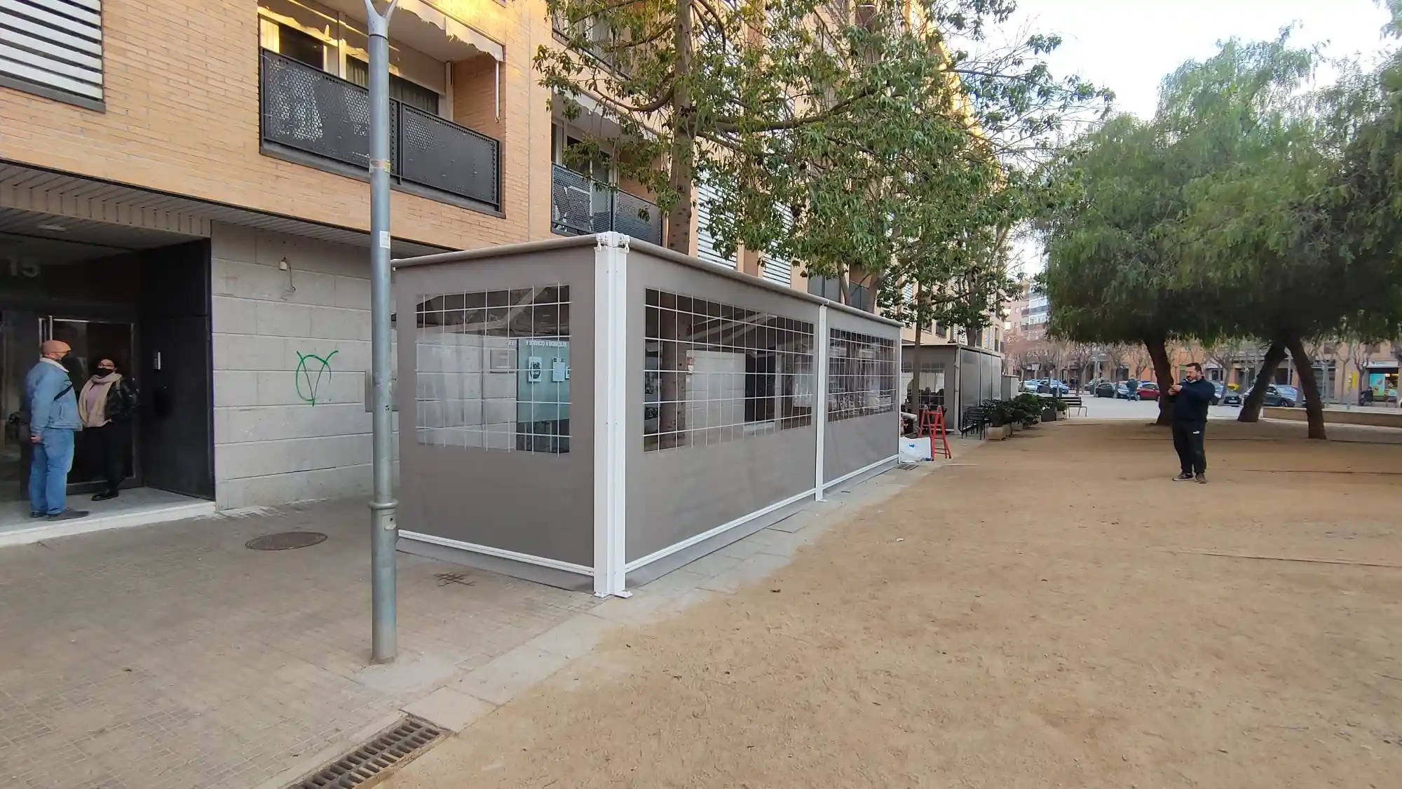 Instalación de cerramiento completo con toldos verticales en tejido técnico gris y ventanas de vinilo transparente para terraza de bar o restaurante en zona urbana de Barcelona. Este sistema de toldos verticales combina protección contra viento, lluvia y frío con visibilidad hacia el exterior gracias a las ventanas transparentes integradas. Estructura de perfiles de aluminio lacado en blanco que crea un cerramiento modular adaptable a diferentes configuraciones. Los toldos verticales se accionan de forma independiente permitiendo ventilación controlada. Solución profesional ideal para terrazas de hostelería en Mataró, Barcelona, Badalona y área metropolitana que buscan ampliar temporada de uso de espacios exteriores protegiéndolos de las condiciones climáticas del otoño e invierno mediterráneo.