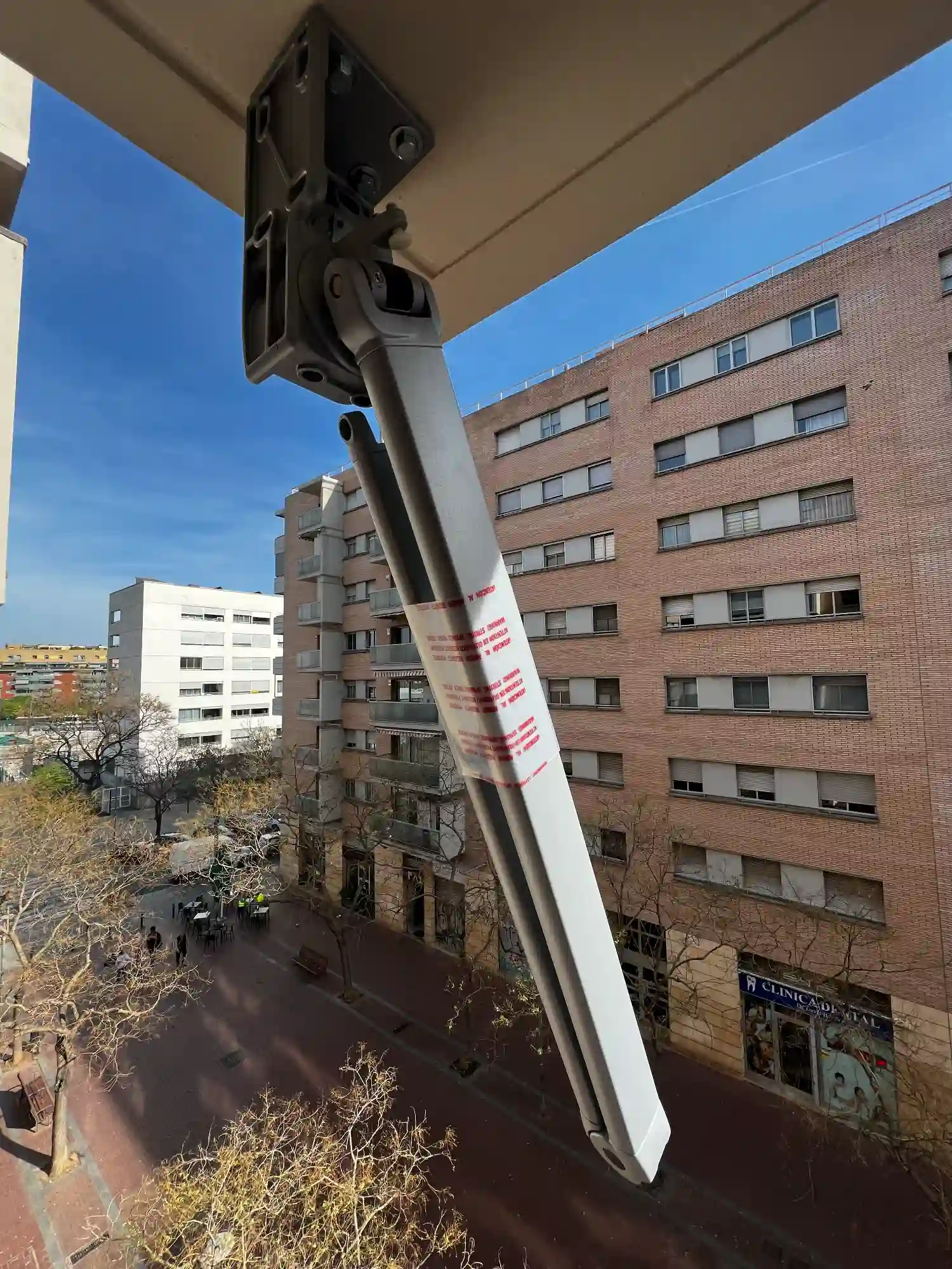 Detalle técnico del mecanismo de brazo articulado y sistema de fijación mural instalado en balcón urbano de Mataró. Esta imagen muestra la calidad de los componentes utilizados en nuestras instalaciones: brazos extensibles de aluminio con articulaciones de precisión, soportes reforzados de anclaje a fachada y sistema de plegado invisible. Los brazos articulados están diseñados para ofrecer máxima extensión y resistencia al viento, fundamentales en instalaciones en altura en zonas costeras del Maresme. Materiales de primera calidad con acabados lacados que garantizan durabilidad frente a la salinidad y condiciones climáticas de la costa de Barcelona. Instalación profesional certificada en Mataró y toda la comarca del Maresme.