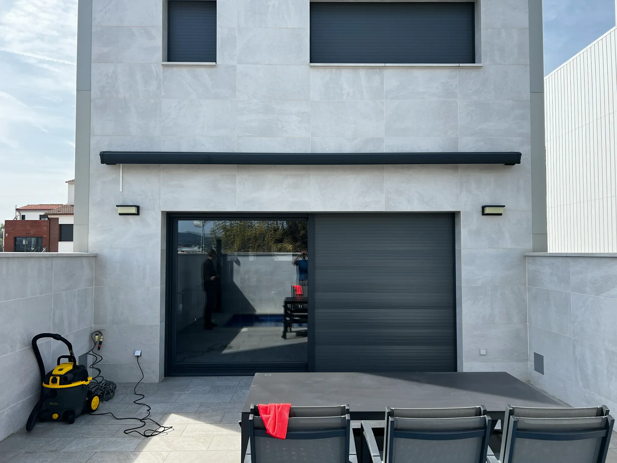 Instalación de dos toldos tipo cofre en aluminio lacado negro sobre terraza de vivienda de diseño minimalista y contemporáneo en Barcelona. Los cofres se integran perfectamente con la arquitectura moderna de la fachada en tono gris cemento, creando líneas limpias y elegantes. El sistema de doble toldo permite cubrir amplias áreas de terraza manteniendo la estética uniforme. Los cofres de aluminio protegen completamente el tejido y mecanismo, especialmente importante en terrazas sin protección superior. Sistema motorizado recomendado para máximo confort. Instalación profesional para viviendas de nueva construcción en Mataró, El Masnou, Premià de Dalt y zonas residenciales del área metropolitana de Barcelona que priorizan diseño y funcionalidad.