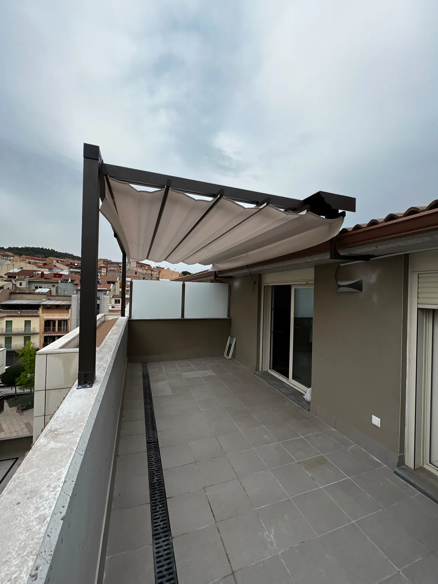 Pérgola con sistema de toldo corredero en tejido beige natural instalada en terraza de ático con vistas panorámicas en el Maresme. La estructura de aluminio lacado en color oscuro contrasta elegantemente con el tejido claro. Los paneles textiles ondulados aportan dinamismo visual mientras se deslizan suavemente por las guías. Este sistema permite disfrutar de las vistas sin renunciar a protección solar en las horas de mayor intensidad. Estructura reforzada preparada para viento característico de zonas elevadas. Perfecto para terrazas en altura en Mataró, Arenys de Mar, Cabrils, Sant Pol de Mar y municipios costeros del Maresme que buscan equilibrio entre protección y apertura al paisaje.