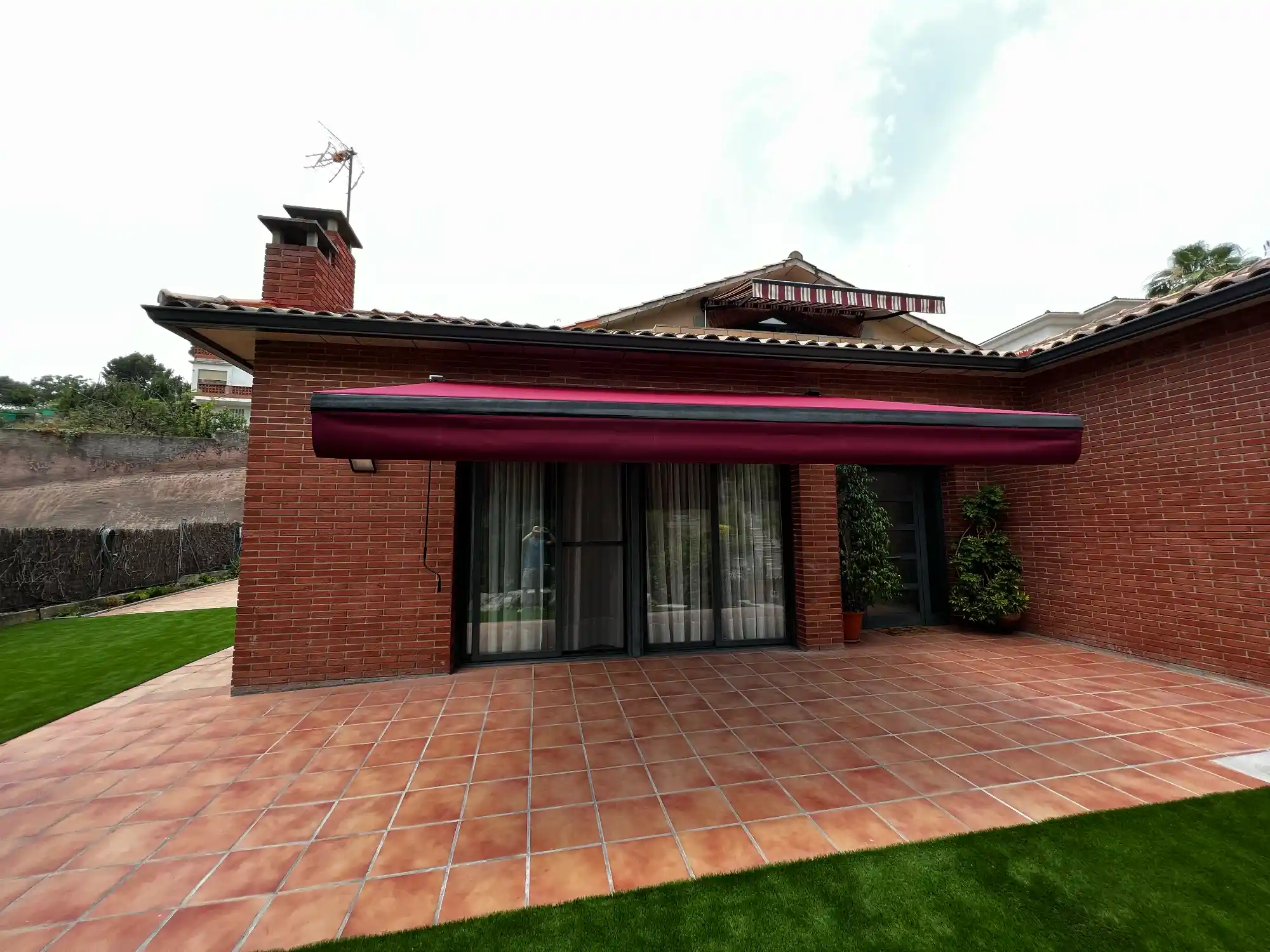 Toldo de brazo extensible en elegante tono granate instalado en vivienda unifamiliar de zona residencial del área metropolitana de Barcelona. Este toldo articulado de formato medio proporciona sombra sobre la terraza principal de la casa, perfectamente integrado con la arquitectura de ladrillo visto típica de la zona. Brazos invisibles con sistema de fijación reforzada a fachada que garantiza estabilidad y durabilidad. Tejido acrílico de alta gama resistente a la decoloración, manteniendo el color intenso incluso tras años de exposición solar. Ideal para viviendas en Mataró, Sant Andreu de Llavaneres, Argentona y zonas residenciales del Maresme.