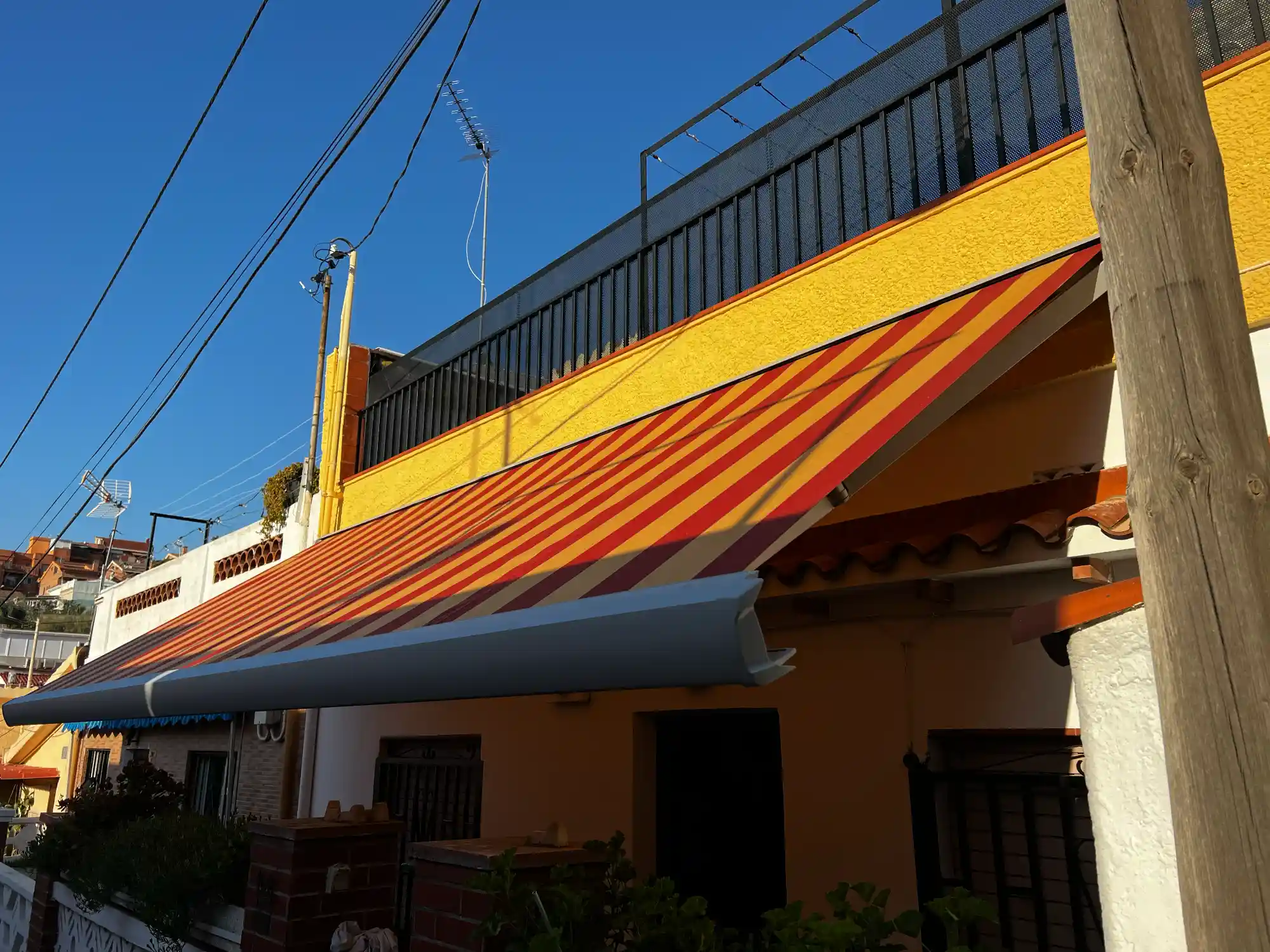 Toldo tipo cofre con tejido acrílico a rayas en tonos amarillo, naranja y burdeos instalado en terraza de vivienda tradicional en zona urbana cerca de Mataró. El cofre de aluminio lacado en tono gris metalizado protege el tejido cuando está recogido, manteniendo los colores vivos durante años a pesar de la exposición solar mediterránea. Las rayas tradicionales aportan carácter y personalidad al espacio exterior. El sistema cofre es especialmente recomendado en zonas sin porche o tejadillo que protejan el toldo de la lluvia. Ideal para viviendas de estilo tradicional en Mataró, Vilassar de Dalt, Premià de Dalt y núcleos urbanos del Maresme que buscan protección duradera con estética clásica.