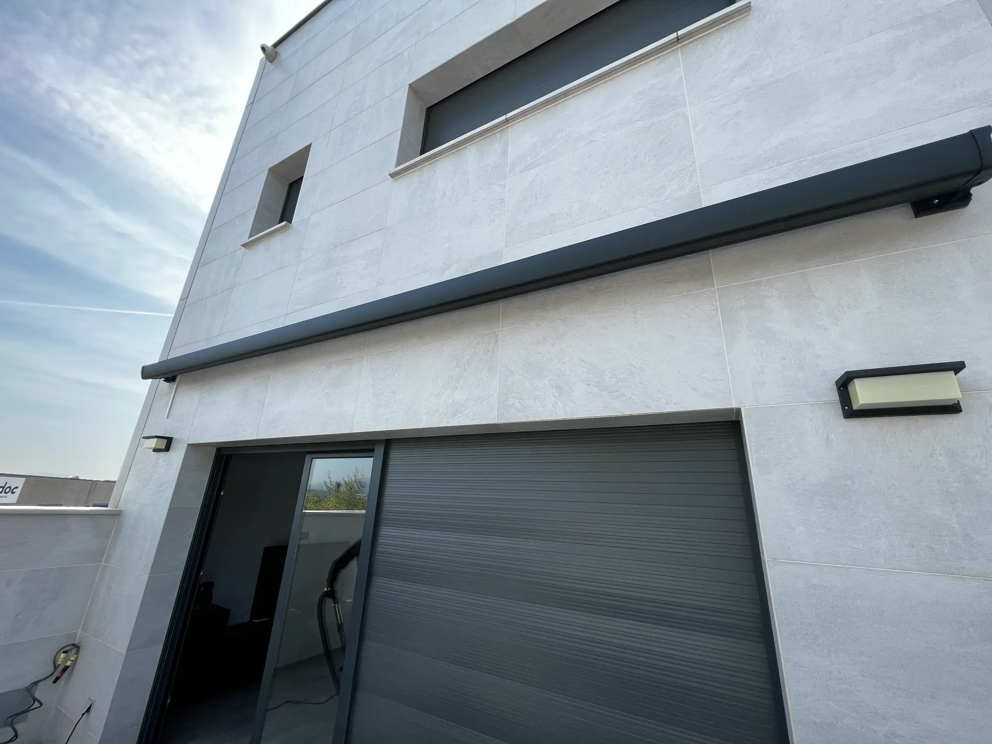 Toldo tipo cofre en posición recogida instalado en terraza de vivienda de nueva construcción con acabados minimalistas en Barcelona. El cofre de aluminio lacado en gris antracita se integra discretamente en la fachada, manteniendo la estética limpia característica de la arquitectura contemporánea. El sistema cerrado protege completamente el toldo de las inclemencias, ideal para terrazas que permanecen sin cubierta adicional. La instalación a ras de fachada optimiza el espacio y mantiene la geometría ordenada del edificio. Solución premium para promociones de obra nueva en Mataró, Vilassar de Mar, Cabrils y desarrollos residenciales modernos del Maresme y área metropolitana de Barcelona.