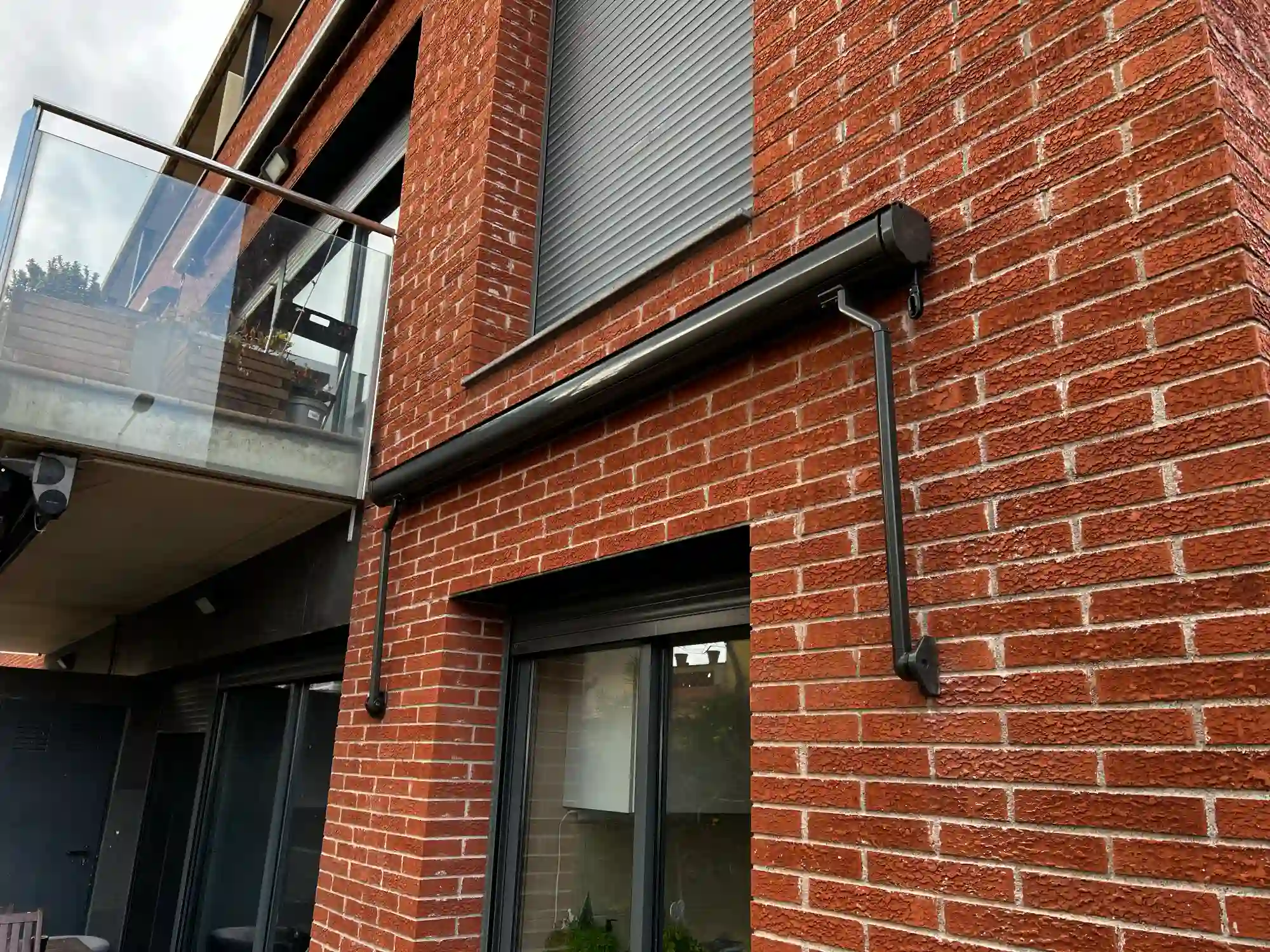 Detalle de toldo para ventana tipo punto recto en posición recogida en edificio de ladrillo visto en Barcelona. Esta imagen muestra la discreción del sistema cuando no está en uso, con el cajón de aluminio lacado integrado sobre el marco de la ventana. El mecanismo de recogida mantiene el tejido protegido y ordenado cuando no se necesita sombra. Los soportes laterales de fijación garantizan estabilidad a la estructura sin necesidad de elementos voluminosos. Solución perfecta para fachadas donde se busca mantener la estética del edificio con mínimo impacto visual. Instalación profesional en Mataró, Barcelona, Badalona y municipios del área metropolitana que valoran diseño limpio y funcionalidad.