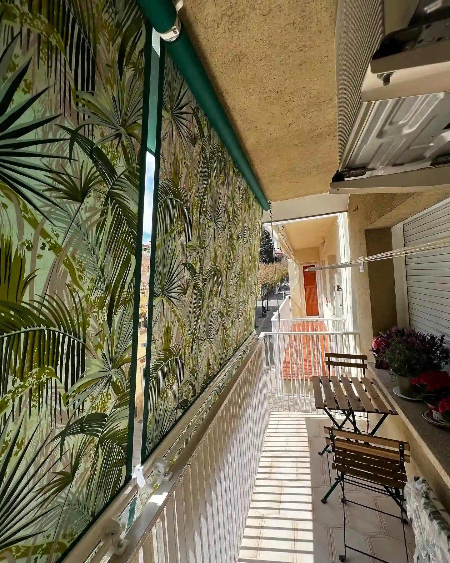Toldo tipo stor telón con tejido de diseño tropical en tonos verdes instalado en balcón alargado de vivienda residencial. El sistema de guiado lateral permite desplegar el toldo de forma uniforme cubriendo toda la superficie del balcón. Esta instalación muestra la versatilidad del stor telón para adaptarse a balcones de diferentes longitudes manteniendo la estética limpia. El tejido decorativo además de protección solar y privacidad aporta personalidad al espacio exterior. Estructura preparada para uso frecuente con materiales resistentes a la intemperie. Ideal para viviendas en Mataró, Premià de Mar, Vilassar de Mar, El Masnou y zonas residenciales del Maresme que buscan combinar funcionalidad con diseño personal en sus balcones.