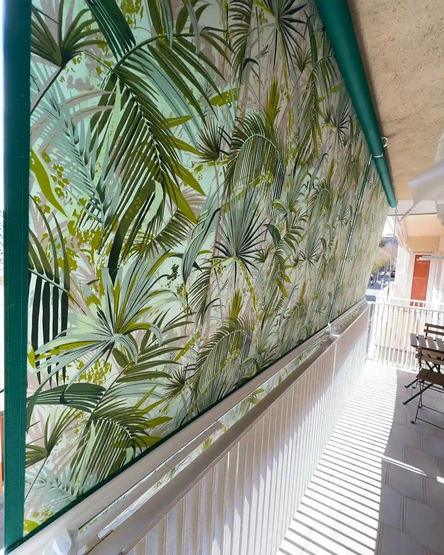 Toldo stor telón con tejido decorativo de motivos tropales en tonos verdes instalado en balcón de edificio urbano en Barcelona. Este diseño personalizado aporta privacidad completa al balcón mientras crea un ambiente natural y fresco característico del estilo mediterráneo. El sistema de guiado lateral mediante cables de acero garantiza estabilidad y facilita el accionamiento manual. Ideal para balcones con orientación a calles transitadas o edificios próximos donde se prioriza la intimidad. El tejido resistente soporta perfectamente las condiciones de exposición urbana. Solución perfecta para pisos en Mataró, Barcelona ciudad, Badalona, Santa Coloma y zonas urbanas densas del área metropolitana que buscan crear un espacio privado y personal en su balcón.
