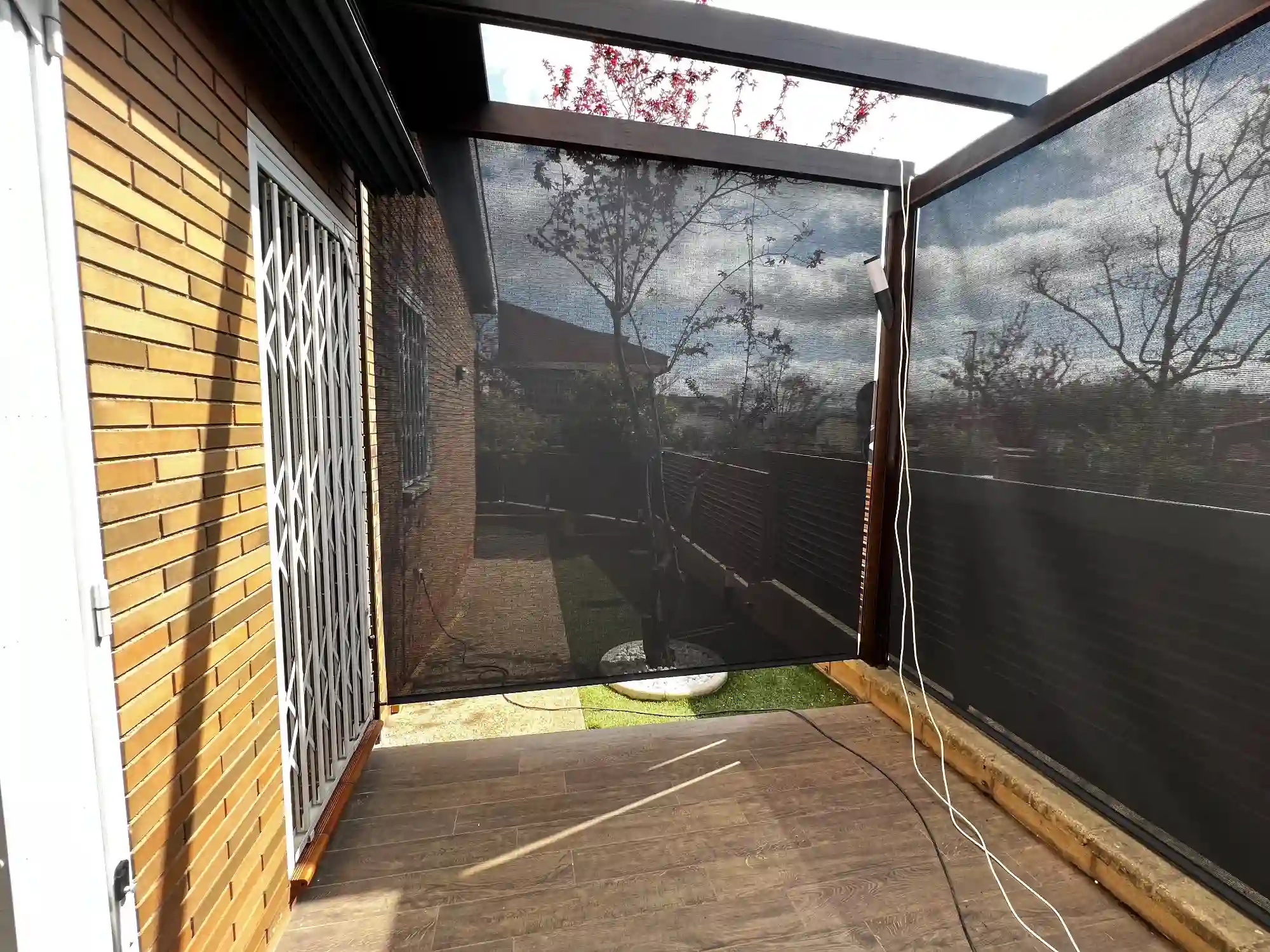 Toldo vertical con tejido screen en color negro instalado en porche de vivienda unifamiliar con orientación a jardín en Barcelona. El tejido microperforado tipo screen permite visibilidad hacia el exterior mientras bloquea hasta el 90% de los rayos UV. El color oscuro reduce significativamente el deslumbramiento creando ambiente confortable en el interior. Sistema de guiado mediante cables de acero que mantiene la tensión perfecta del tejido. Especialmente recomendado para porches, pérgolas y espacios cubiertos que necesitan protección solar sin perder contacto visual con el jardín. Perfecto para viviendas unifamiliares en Mataró, Vallès Oriental, Maresme interior y zonas residenciales de Barcelona con espacios exteriores cubiertos.